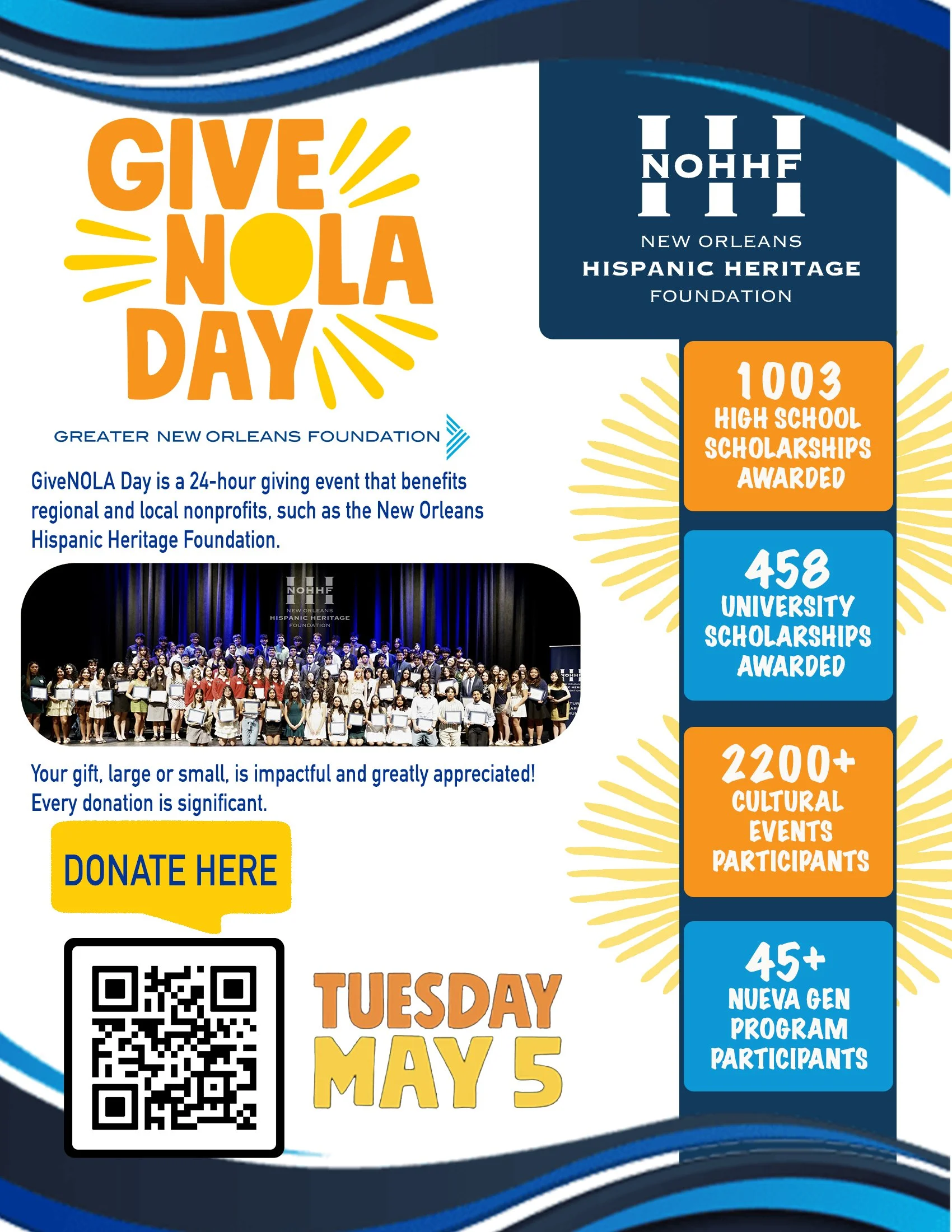 The New Orleans Hispanic Heritage Foundation (“NOHHF”) is a non-profit community organization whose main purpose is to cultivate and promote the Hispanic heritage within the New Orleans community and the greater region. The NOHHF supports activities that provide an opportunity to experience Hispanic culture through art, education, culinary flavors, and music with the aspiration of creating a stronger more diverse and culturally rich community.